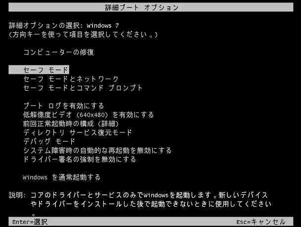 電源投入後、F8キーをトントン押してセーフモード画面を出します。セーフモードを選択して、エラーが出る前に行った操作を取り消します。